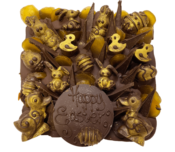 Bling On The Ginger! All that Glitters is EDIBLE GOLD! Glorious Ginger slices mix it with Ducks. Bunnies. Eggs… All Glammed Up in Edible Glitter! Dark Chocolate base with Divine dark Chocolate Shards + Ginger + the Glam Clan … Bling It On!