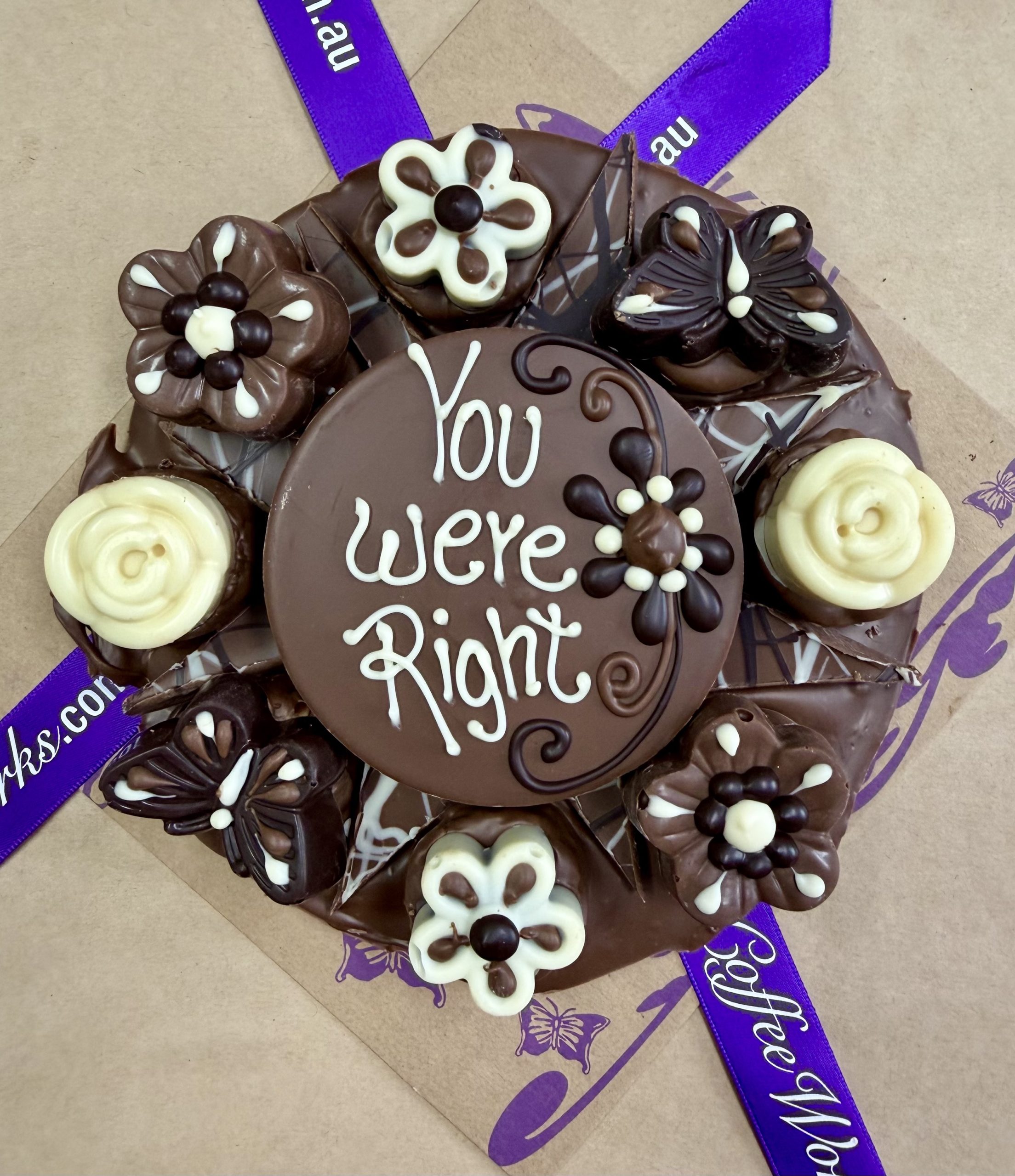 Milk Chocolate Base with Marshmallow. Shards and a Combo of Milk, White and Dark Chocolate decorated Flowers and Butterflies.